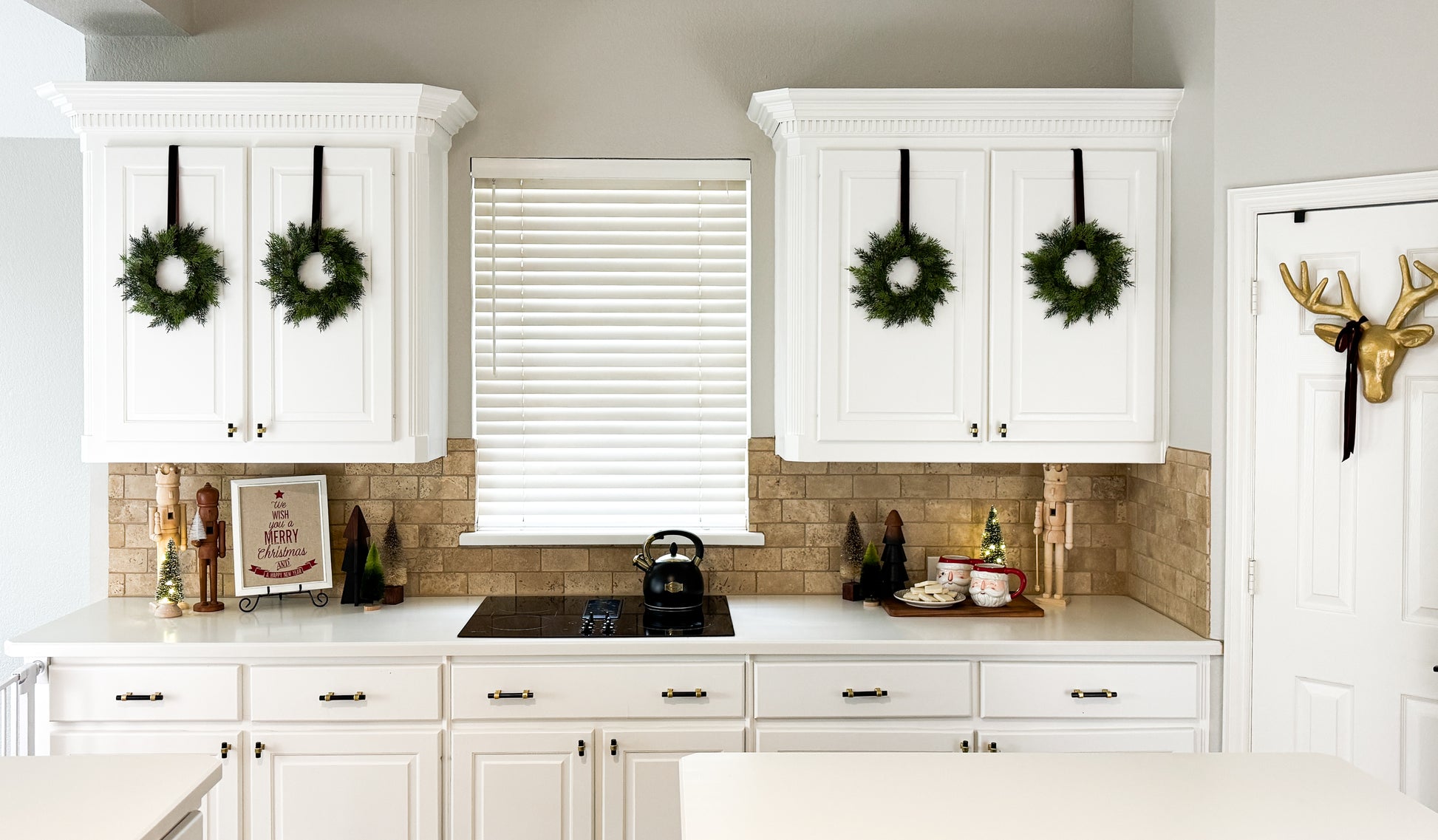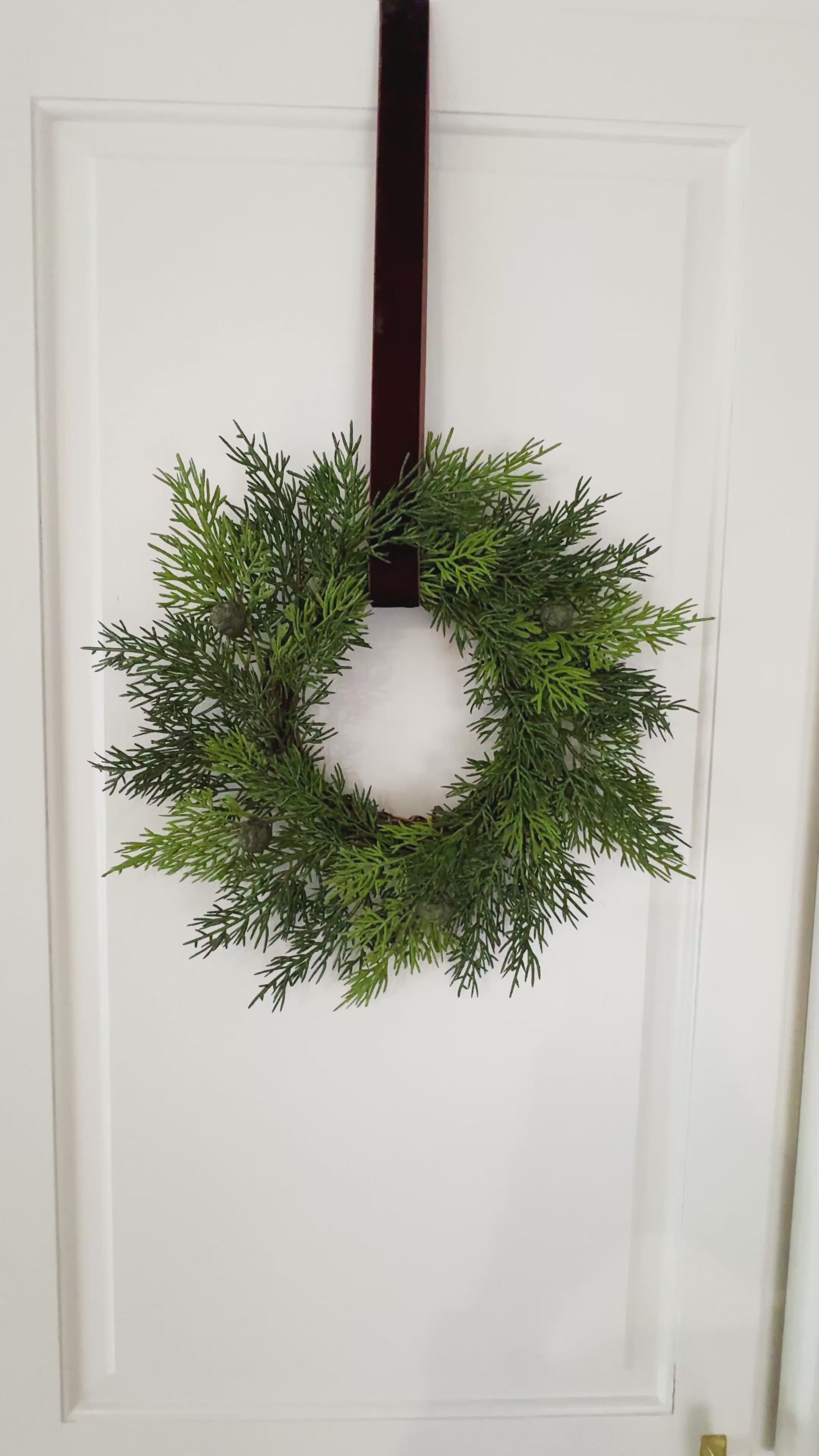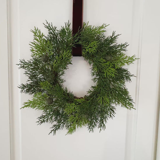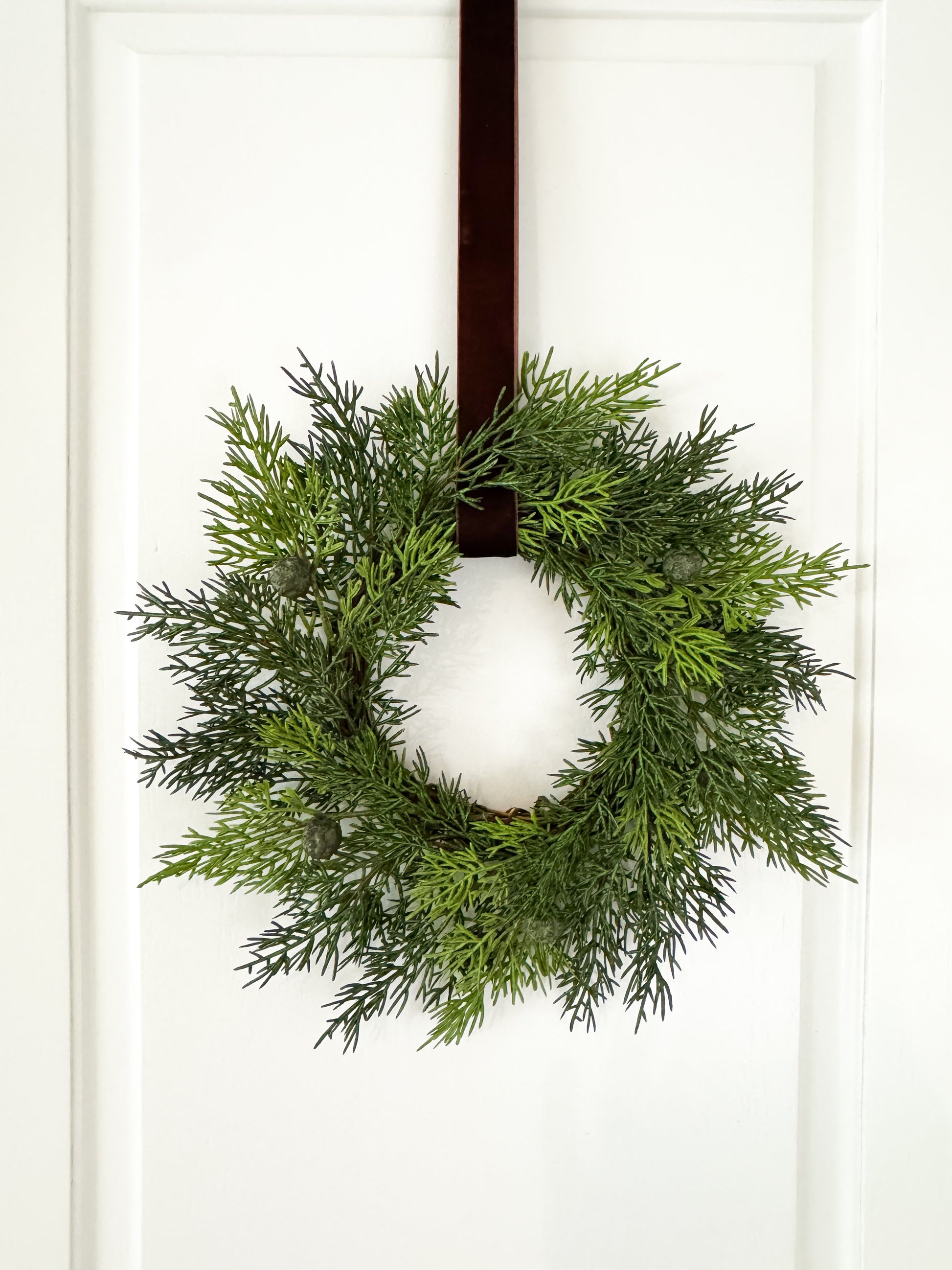 Add a pop of greenery to your farmhouse kitchen décor with this mini cedar Christmas wreath set accented by brown velvet ribbon. An indoor holiday greenery wreath set that will look perfect hanging on kitchen cabinet doors, in an entryway, living room, family room, or anywhere a farmhouse touch is needed.